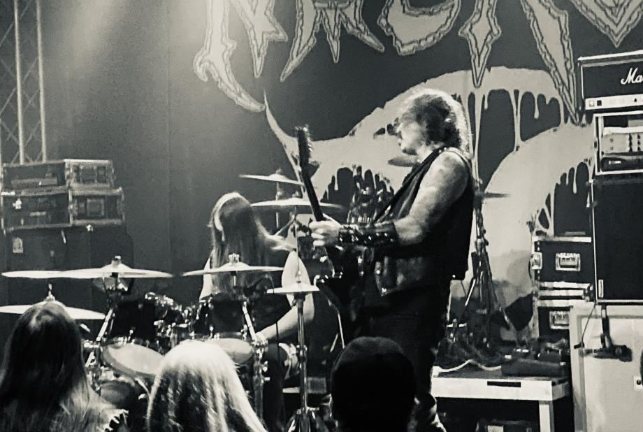 Die Supportband Necrot, die zu diesem Zeitpunkt ihre ersten Songs anstimmen, könnten in das sich mir bietende Gesamtbild nicht besser passen. Alle drei sehen aus wie direkt aus einem Metal-Katalog spaziert, die Anlage, über die sie ihre Musik schmettern, ist unfassbar laut aufgedreht und man versteht weder das eigene Wort noch das des Sängers der Band (letzteres ist aber wohl eher Teil des Konzepts). Das klingt jetzt alles erstmal nach einer ziemlich stereotypen Metalshow, was dem Ganzen aber die Krone aufsetzt ist die Inszenierung auf der Bühne. Auf der ist es nämlich während des gesamten Abends hell erleuchtet, was der wahrscheinlich angestrebten martialischen Atmosphäre nicht besonders zuträglich ist. Es entsteht ein wenig Turnhallenatmosphäre, und ich muss mehr als einmal schmunzeln. Die Umstehenden scheint das alles aber nicht im geringsten zu stören, im Gegenteil: das Publikum quittiert jedes “How the fuck are you doing?!” mit hopfigem Gröhlen und schon jetzt werden ordentlich Heads gebangt und Pommes gegabelt. Mitreißen können mich Necrot in ihrem 30-minütigen Slot nicht, ich fühle mich aber trotzdem gut unterhalten.