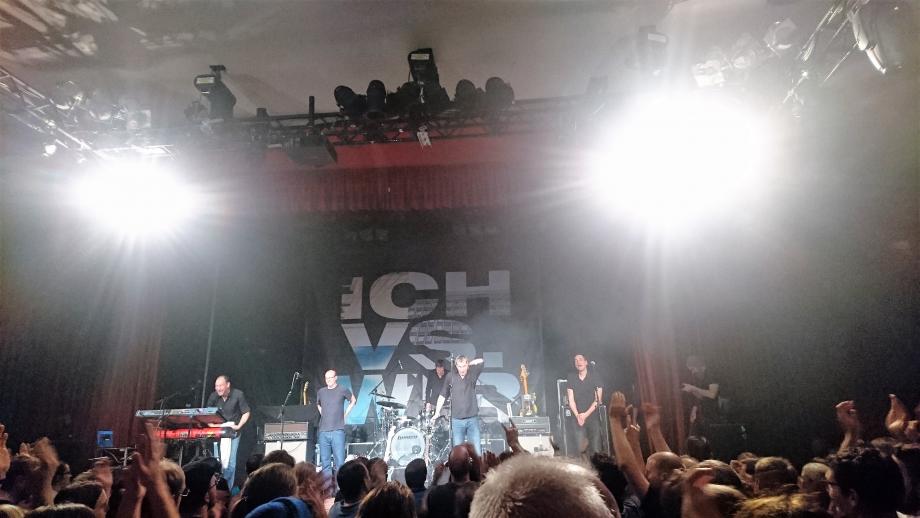 Nun ging es in den Umbau, die letzten Soundchecks wurden gemacht, der Banner mit „Ich Vs Wir“ wurde hochgezogen. So langsam stieg die Vorfreude immer mehr. Kurz nach neun wurde dann die Beleuchtung im Saal gelöscht und die Bühne in einen dunkelblau-violettes Licht getaucht. Marcus und Lars Wiebusch betraten die Bühne. Das Keyboard erklang und wie man es in alter Kettcar-Manier kennt, begann man ohne Intro und großem Geschnörkel nur mit der Ansage: "Kettcar - Hamburg". Die Kettcar-Kenner erkannten, was vom Keyboard angestimmt wurde: “Balkon gegenüber“. Nach und nach kamen nun auch die restlichen Bandmitglieder auf die Bühne und stiegen in das Lied mit ein. Das Publikum sang lauthals mit und umjubelte den Opener. Fast im nahtlosen Übergang ging es auch gleich mit einem weiteren „Klassiker“ weiter: „Graceland“. Die Stimmung im Saal wurde noch besser, die Leute tauten immer mehr auf. Nach dem zweiten Song begrüßte Marcus Wiebusch die Menge etwas ausführlicher zu diesem besonderen Abend. Er zählte Bands und Musiker wie Bruce Springsteen auf, die ebenfalls schonmal ein Album komplett gespielt hatten. Leider wurde in dieser Aufzählung eine wichtige deutsche Band vergessen, die Meister im Album durchspielen: Turbostaat. Aber naja, wer will denn kleinlich sein. Die zwei nächsten Lieder wurden als Liebeslieder ankündigt, eines mit Happy End, eines ohne. So beendeten Kettcar ihren „Aufwärmblock“ mit "Rettung" und "48 Stunden". Schon in den ersten vier Liedern hatte sich bei mir eine eine Mischung aus Dauergrinsen und Gänsehaut eingestellt