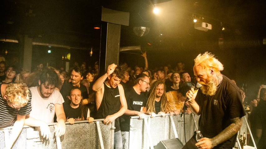 Den Anfang machen aber erst mal Planlos aus Ost-Berlin. Das ist wichtig anzumerken, da es Planlos zweimal gibt. Einmal Planlos West (das sind die, die man auf Spotify findet) und einmal Planlos Ost, welche eventuell aus der „Auswärtsspiel Doku“ der Toten Hosen bekannt sind und auch generell einen zentralen Pfeiler des Punks in der DDR darstellen. Planlos spielen ein hervorragendes Set, keine Frage. Nicht eine Sekunde merkt man ihnen die zahlreichen Jahre an, welche sie nun schon auf dem Buckel haben. Ihre Songs handeln noch immer von Widerstand, Staatsmacht und wahnsinnig vielen Ost-Punk-Staples, die heute zwar teilweise nicht mehr so aktuell sind, aber trotzdem nicht unnötig oder deplatziert klingen. Das Problem ist nur das Publikum, dieses reißt das Ganze so gar nicht mit. Im Set sind schon ein paar Momente, in welchen man sich gegenseitig rhythmisch schubsen könnte, das passiert jedoch nicht. Schade, aber die, die sie kannten und etwas mit ihnen anfangen können, genießen die Minuten sehr!