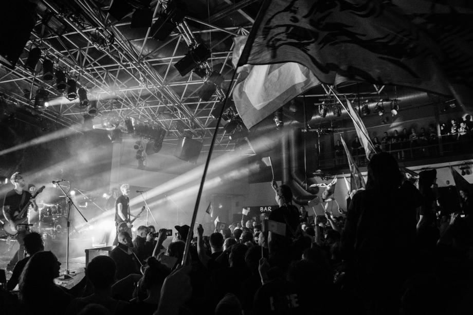 21:15 Uhr – Zeit für die Hauptband. Während vor der Bühne das „Nichts zu Verlieren“ - Albumcover in riesiger Dimension die Bühne vor Blicken abschirmt, wuselt sich das Streetteam der Rogers in Formation durch die Menschenmenge des ausverkauften zakk um direkt vor der Bühne Stellung zu beziehen. Das Intro von „Nie Euer Land“ startet und mit den Drumrolls schießen auf jeden Trommelschlag Konfettikanonen aus den Händen der sich vor wenigen Sekunden noch durchgewuselten Streetteam-Menschen und tauchen die Konzerthalle in ein wahres Konfettimeer. Von der ersten Sekunde an also Vollgas und schon mit dem Drop des Banners eskaliert die Menge als ob die Band schon eine Stunde spielt. Die ersten Körper halten es nicht mehr im Erdgeschoss aus und schweben über die sich wogende Masse mitsingender Besucher in die sanften Arme der aufmerksamen Security-Mitarbeiter.