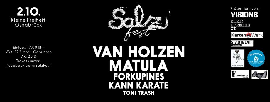 Und auch außerhalb des Headlinerpostens versammelt das Salz Fest einiges an spannenden Bands in seiner Künstler-Riege. Die norddeutschen Indie-Punks Matula wandeln mit ihren melancholisch-anmutigen Hymnen musikalisch etwa auf einem Grat zwischen Love A und Captain Planet. Die Songs der Forkupines zeugen von einer fast ebenso zarten Schrammeligkeit, ecken gleichzeitig aber mit stimmigen Emo-Melodien an. Die Berliner Kann Karate reichern ihren nachdenklichen Post-Punk mit viel Leidenschaft und Herzblut an. Ein echter Geheimtipp sind Toni Trash, deren melodischer Post-Hardcore im steten Kampf zwischen Melodik und Ausbruch steht.